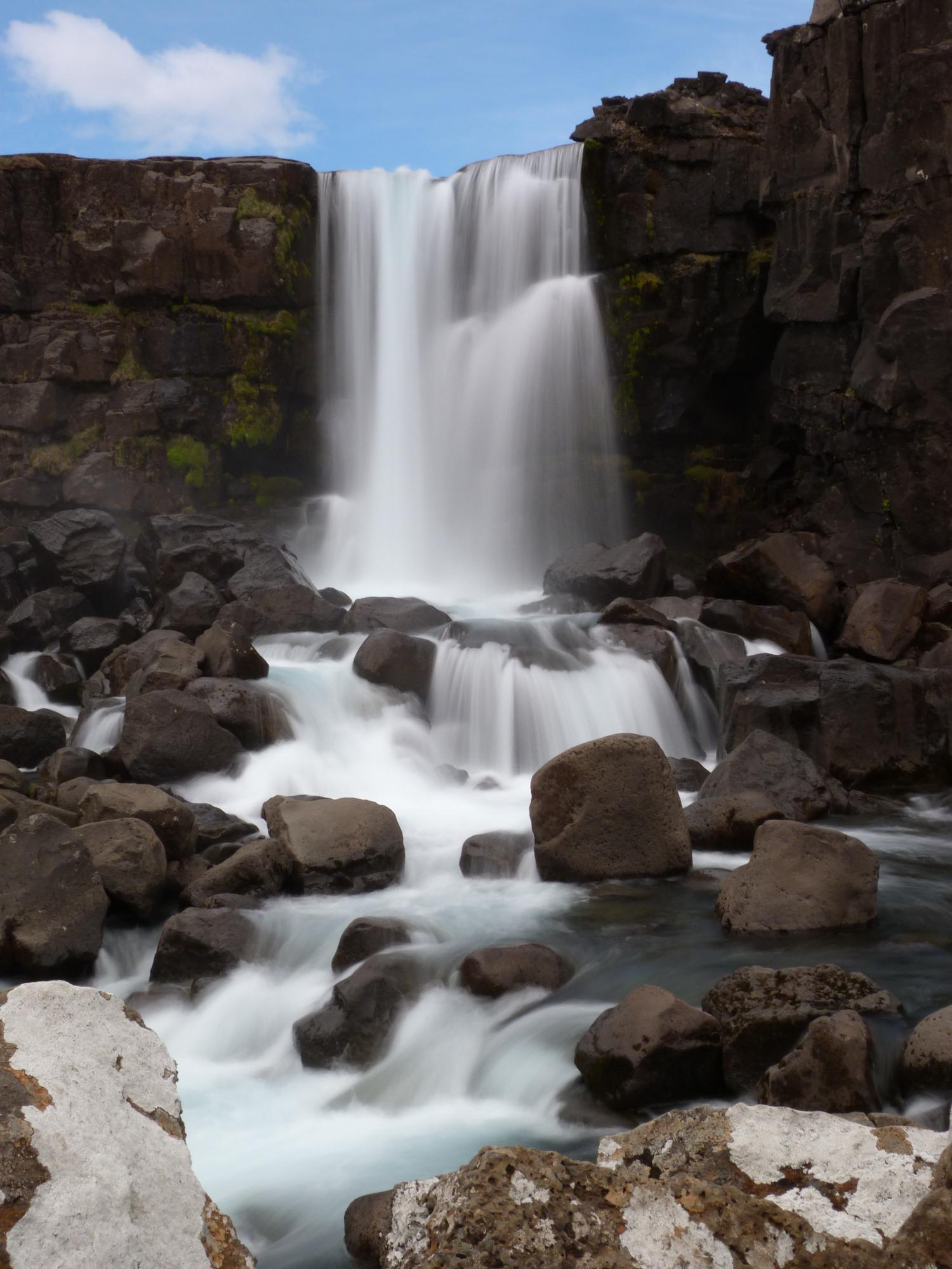 Dimanche 12 juin : on petit déjeune dehors au soleil, il fait 11°C ! Vers 10h00, on part pour Thingvellir. Il y a environ 1h00 par la route 36. C'est l'endroit où se rencontrent les 2 plaques américaine et européenne. Une ballade permet de voir les falaises, le site de l'Hémicycle (lieu où se réunissait le premier parlement - classé au patrimoine mondial de l'Unesco), la cascade Oxararfoss,