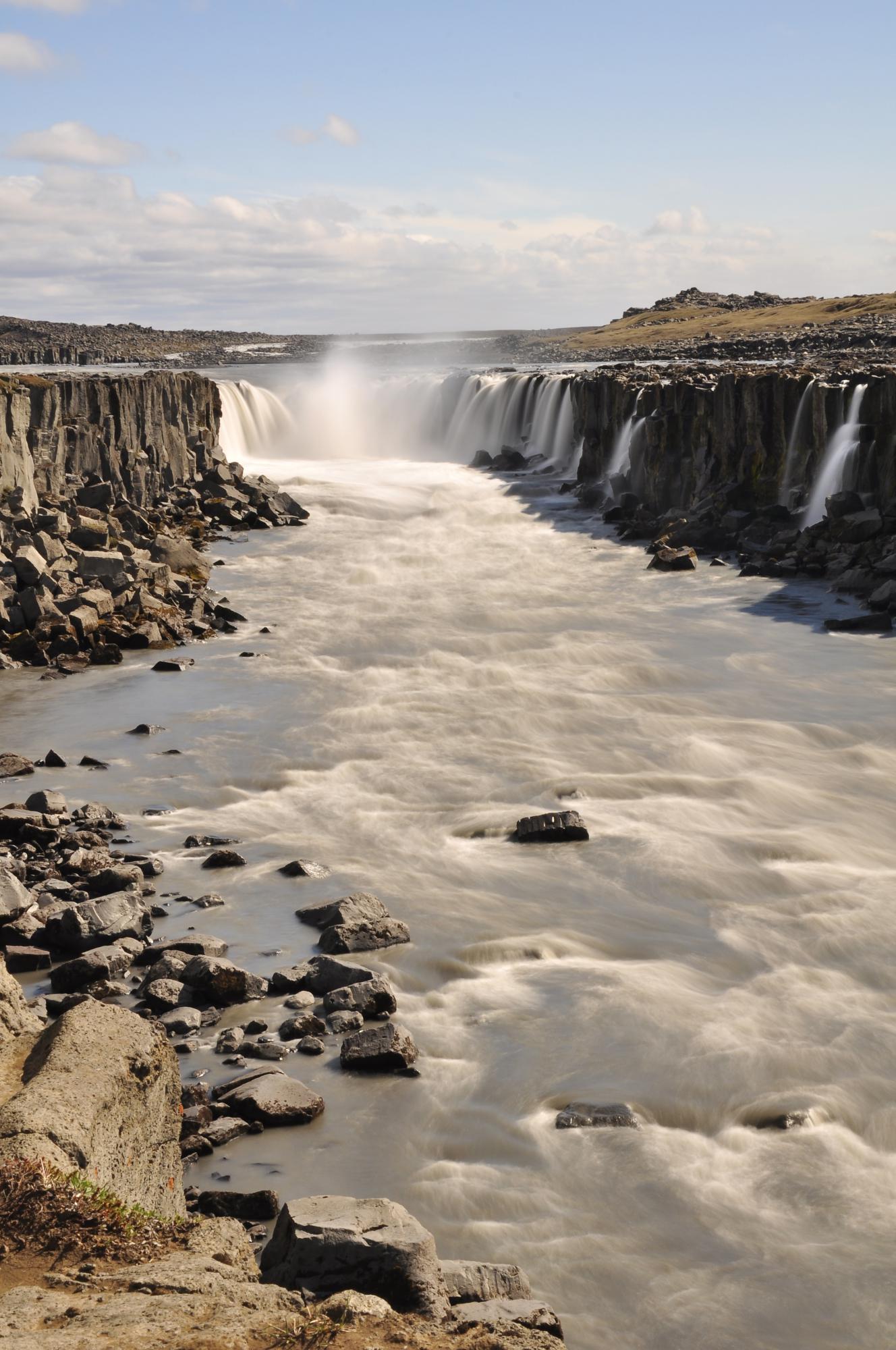 Mardi 21 juin : sur la route, on s'arrête prendre des photos d'un paysage lunaire avec en arrière plan une montagne enneigé que l'on suppose être l'Askja. On arrive au parking de Dettifoss côté est. On pique-nique avant d'attaquer la ballade vers les cascades. On met 10 min pour aller à Dettifoss. C'est la plus puissante chute d'eau d'Europe : 44m de haut, 100m de large et un débit de 200m3/s. Elle est grandiose. On continue notre marche sur 1,4kms pour aller voir Selfoss.