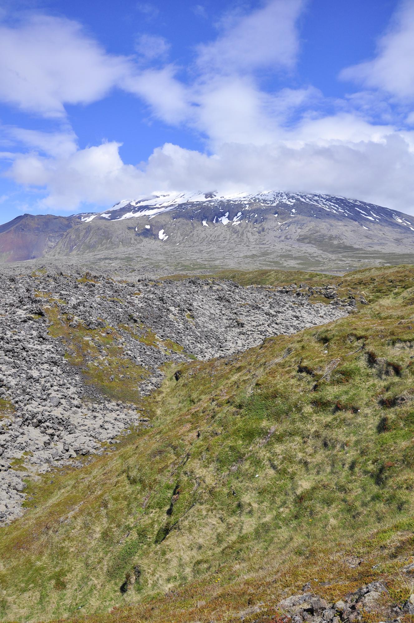 Samedi 25 juin : on consacre la journée à faire le tour de la Péninsule de Snaefellsnes. On commence par le Mont Helgafell. Le but est de monter sans dire un mot et sans se retourner. Une fois en haut, il faut se diriger vers les ruines, faire face à l'est et faire 3 vœux. Il paraît que ça marche ! A Olafsvik, on s'arrête dans une Bakari (boulangerie) acheter croissants et gâteaux islandais qu'on déguste sur une table de pique-nique vers 11h00. Au Musée Sjomannagardur à Hellisandur, on a une belle vue sur le volcan/glacier Snaefellsjokull.