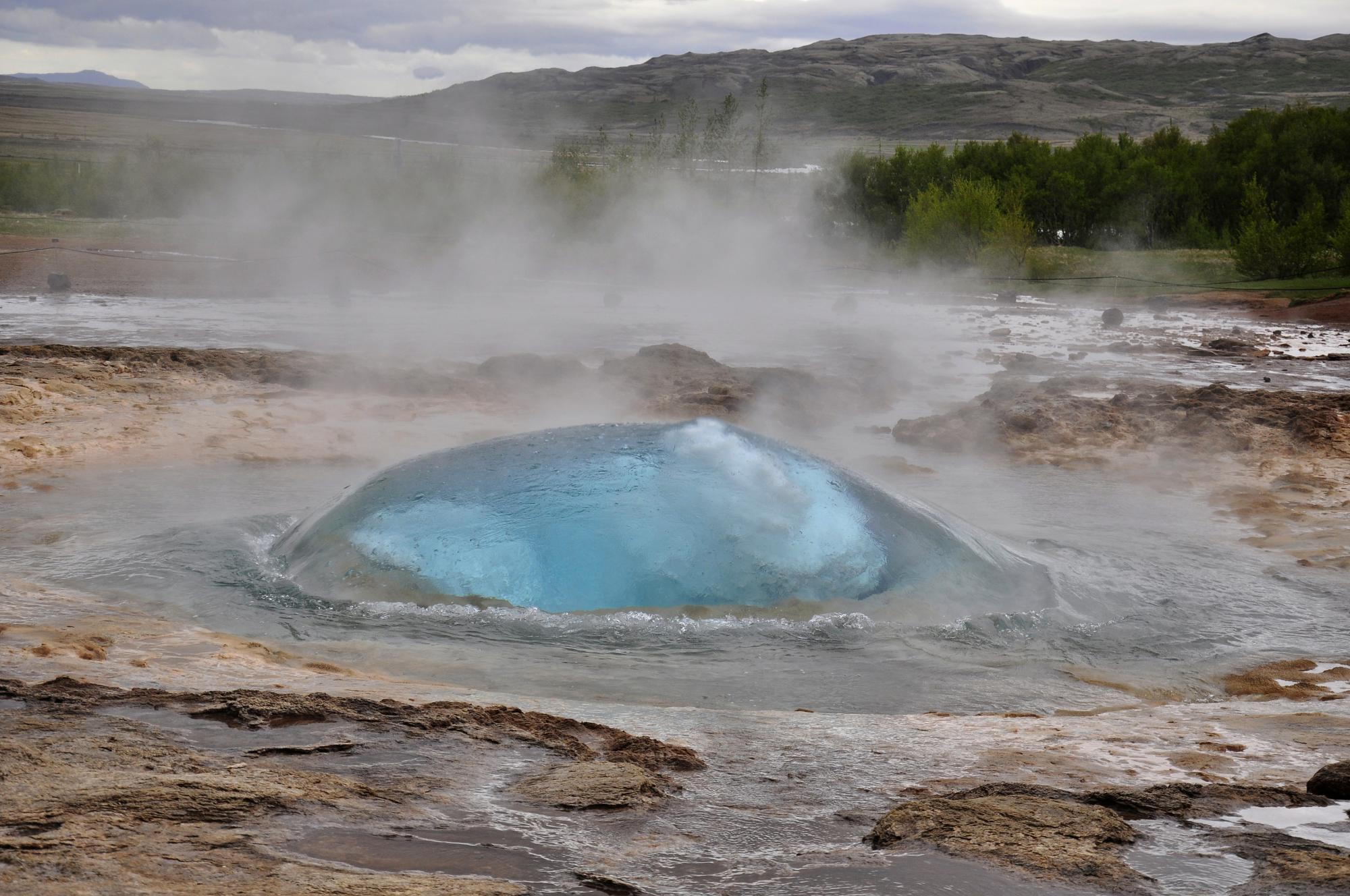 Lundi 13 juin : le temps est couvert et il pleut. On prend la direction de Geysir. On visite ce petit parc géothermique où l'on peut admirer geysers et mares de boue bouillonnante. Les deux principales attractions sont «Grand Geysir» dont les éruptions sont irrégulières (rien lors de notre passage !) et le «Strokkur» qui entre en éruption toutes les 5-8 min. Nous y avons passé pas mal de temps à essayer de photographier sa bulle bleue avant l'explosion.