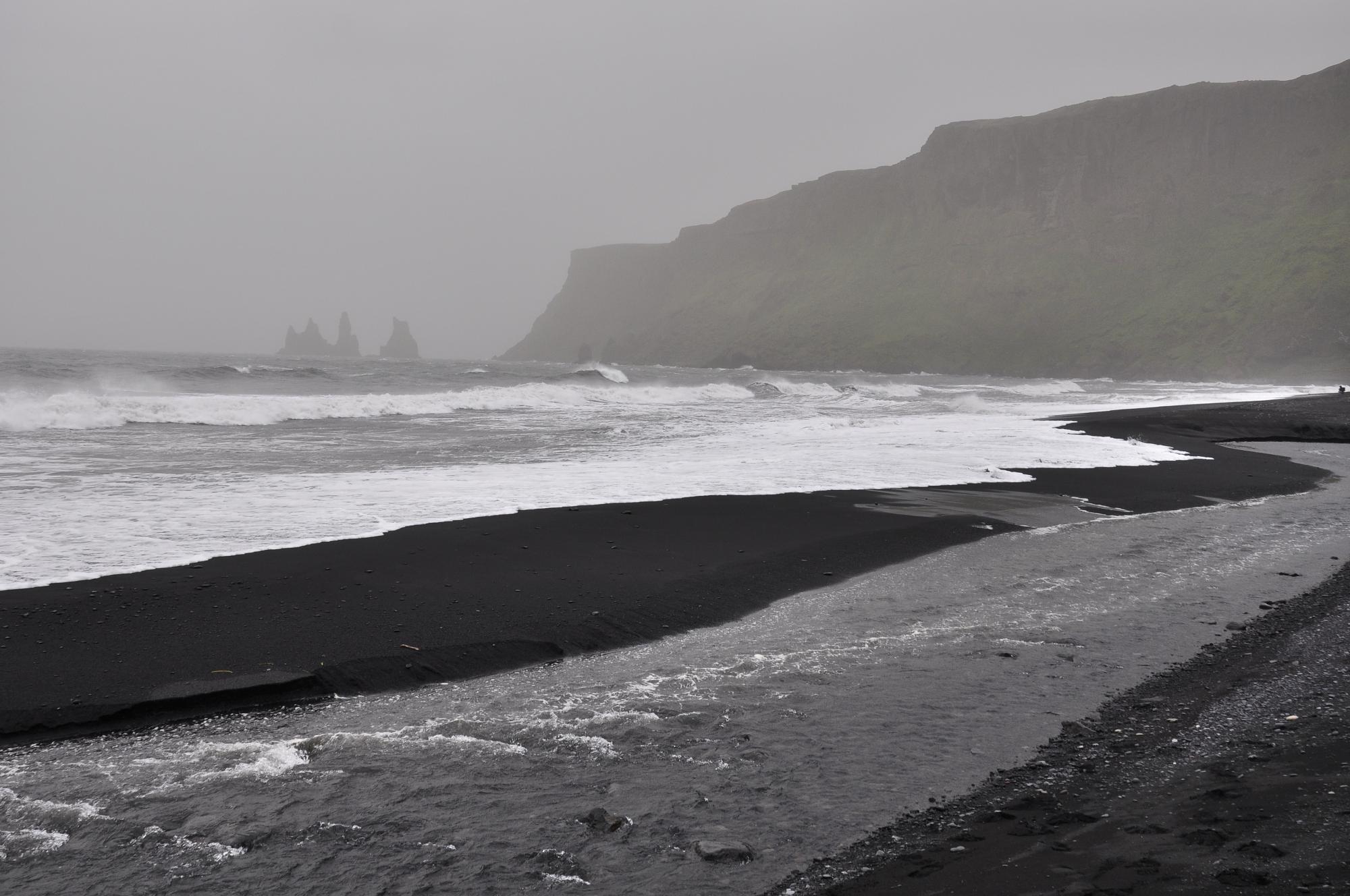Mercredi 15 juin : départ sous le soleil, 12°C. On continue de parcourir la route 1. Le premier arrêt est à Seljalandsfoss. C'est une superbe cascade de 40m de haut où l'on peut passer derrière. Mais attention, ça glisse ! On rencontre ici un groupe de touristes français de notre région ! L'arrêt suivant est pour un view point qui montre l'éruption de l'Eyjafjallajokull. Puis on continue vers Skogafoss. Autre belle cascade de 62m qu'on peut voir d'en bas ou d'en haut en empruntant un escalier un peu raide. La vue d'en haut n'est pas exceptionnelle. Ensuite, on poursuit notre route vers Vik. Petit village sur une plage de sable noir. Là, le temps se gâte : c'est très couvert, très venteux et froid.