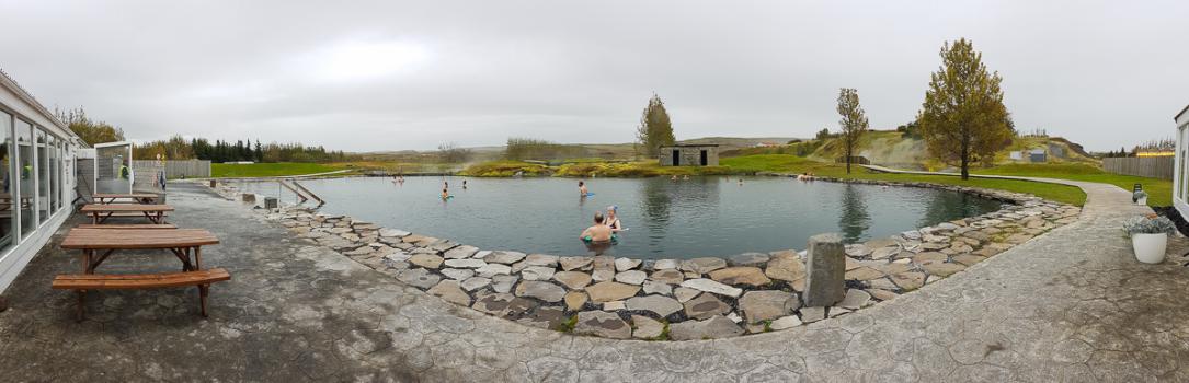 Lundi 19 septembre : debout à 7h45. Temps pourri aujourd'hui. On part à 8h30, il fait 11°C. Du coup, on va trempouiller dans les bains chauds de Secret Lagoon à Fludir où l’on arrive à 11h00 (réservation à l’avance). L’eau est à 38-40°C. On est pas mal !