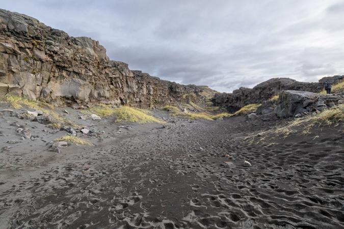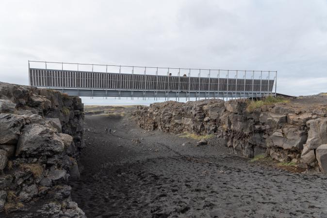 On aperçoit 2 phoques dans la mer. Retour à la voiture à 11h15. 14°C. Sur la route, on voit plein de voitures garées. On va voir. L’endroit s’appelle Bru Milli Heimsalfa. Il s’agit d’un pont qui a une jambe sur la plaque nord américaine et une jambe sur la plaque européenne.