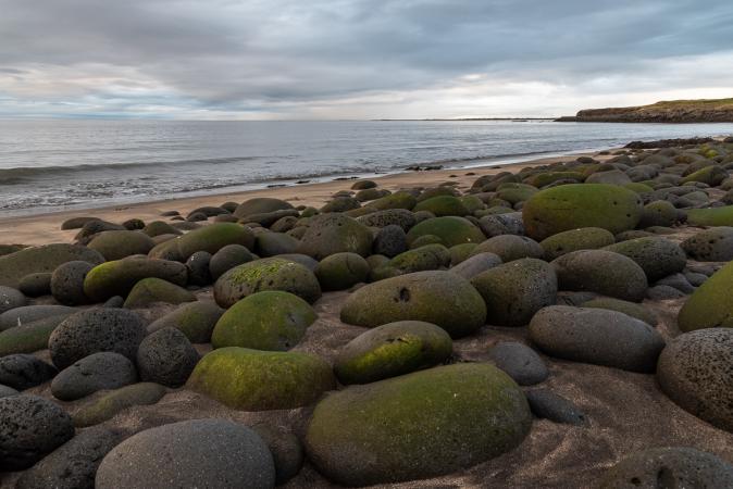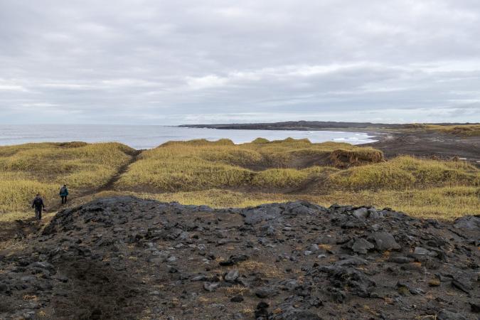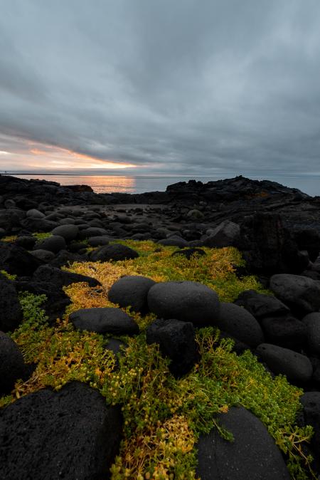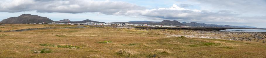 Samedi 17 septembre : debout à 7h00. Petit déjeuner à l’hôtel. On va récupérer la voiture chez Sixt juste à côté. On avait décidé de la prendre seulement aujourd’hui et non hier soir afin d’économiser une journée de location. C’est une Toyota Corolla Hybride. On quitte l’enceinte de l’aéroport à 9h30. Le ciel est voilé et il fait 10°C mais il fait doux, il n’y a pas de vent. On va consacrer la journée à la Péninsule de Reykjanes, au sud-ouest, avant de rejoindre Reykjavik et notre appartement ce soir. On commence par aller faire une balade à Stora-Sandvik dans un champ de lave ancienne recouverte de verdure jusqu'à une plage de sable noir. Les petites mousses vertes presque fluos sont jolies.