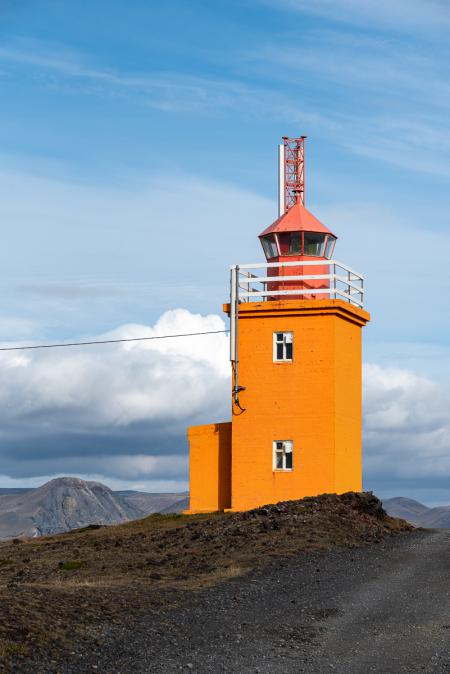 Après une bonne heure de pause, on va voir le joli phare orange de Hopsnes, sous le soleil. Ca pète cette couleur !