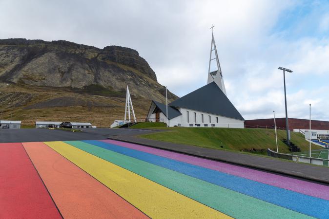 On s'arrête ensuite voir la drôle d'église de Olafsvik. Hormis sa forme moderne, la route qui y mène est aux couleurs de l’arc en ciel.