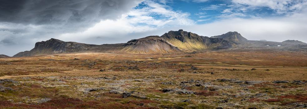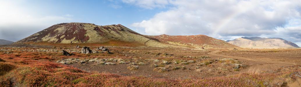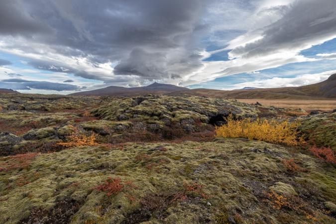 Puis, vers 10h15, on emprunte un bout de la piste Berserkjahraun pour aller voir un champ de lave avec vue sur des cratères. La lave est recouverte de mousses, d’arbustes jaunes, rouges qui ressemblent à des myrtilliers. C'est bien coloré.
