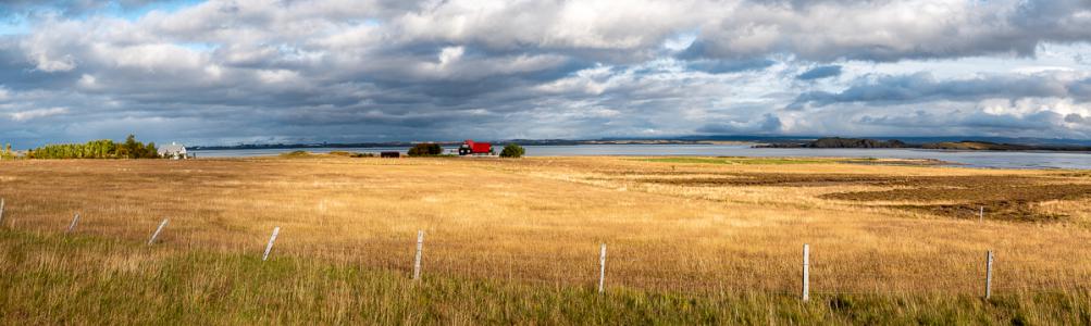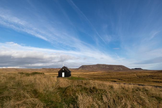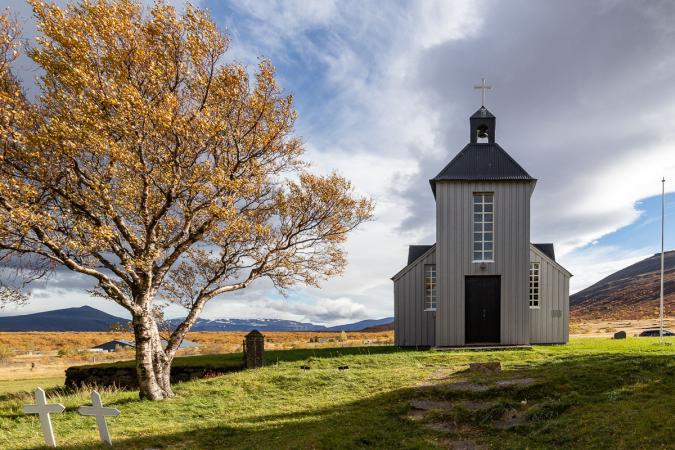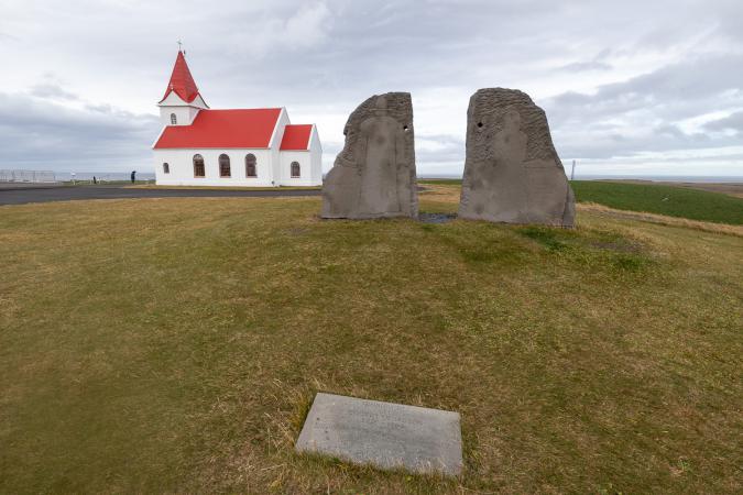 On reprend la route à 15h00. Une petite église blanche au toit rouge au milieu de nulle part attire l’œil. Hop un p'tit arrêt photo ! C’est l’église de Ingjaldsholl.
