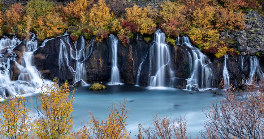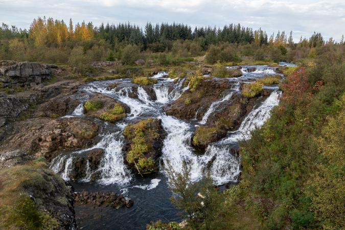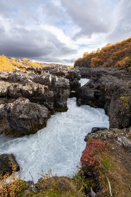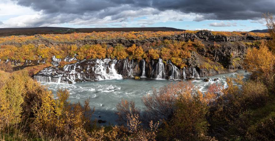 On file vers les gorges de la Hvita, au nord-est de la capitale. On arrive à 10h30. Le soleil fait son apparition sur les cascades de Hraunfossar. Avec les couleurs d'automne qu'a revêtue la végétation, c'est magnifique. On profite du soleil pour faire pas mal de photos.