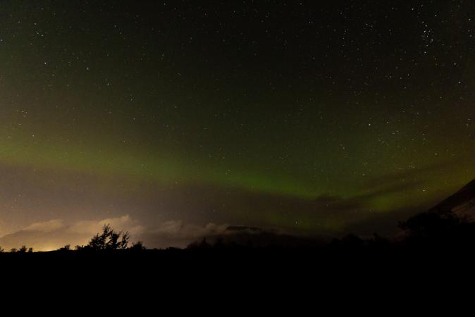 Maintenant le temps étant complètement bouché et la pluie intense, on fait route vers Reykjavik. Pour le dîner, on va au restaurant Skalli, à côté de l’appart : burger pour les gars, fish & chips pour moi. C’est très bon. Le ciel étant bien dégagé, on tente d’aller voir des aurores boréales. On sort un peu de la ville et on aperçoit de très légères lueurs vertes dans le ciel à la prise de vue photo. Mais ce n’est pas folichon !