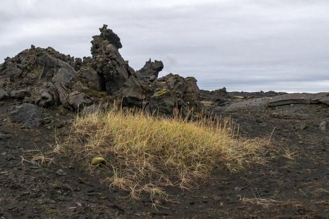 Il y a beaucoup de petites églises en Islande, plus ou moins perdues au milieu de nulle part. La plupart sont ouvertes et on a l’impression qu’elles sont meublées de meubles Ikéa ! On fait un stop à Husafell acheter des sandwichs pour ce midi. Toujours sur la route 518, près de Vidgelmir, on s’arrête dans un champ de lave recouvert de végétation : des mousses vertes, des plantes rouges, jaunes et le noir de la lave, c'est joli mais dommage que le soleil se soit caché.
