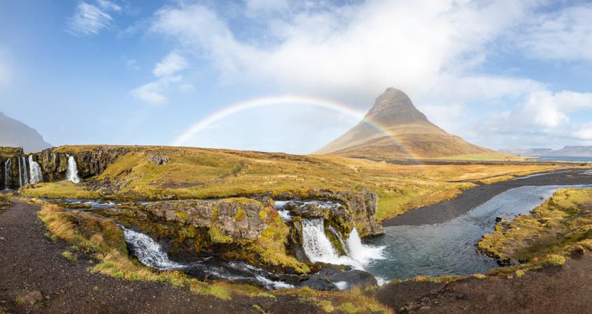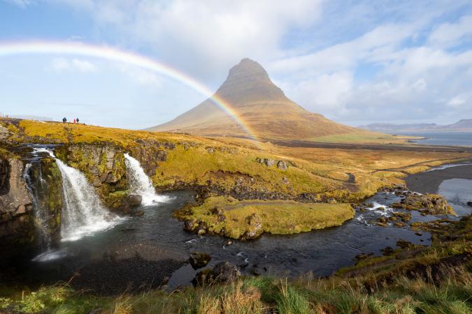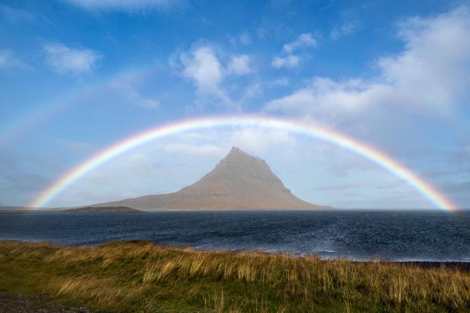C'est bucolique comme diraient certains ! On prend un peu de hauteur en montant sur une colline. Il commence à tomber quelques gouttes de pluie. On reprend la voiture à 11h15 et on continue vers le fameux point de vue sur Kirkjufell. Il se met à tomber une pluie fine. Mais finalement quelle chance ! Cela nous offre un joli arc en ciel sur la montagne Kirkjufell. Petit arrêt en bord de route :