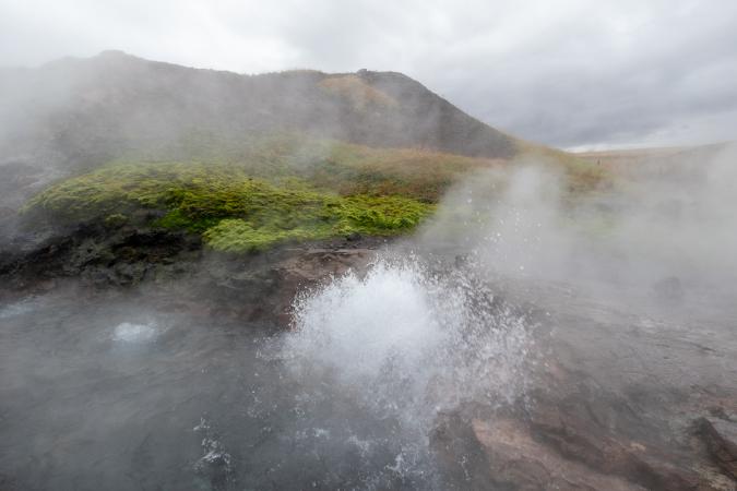 On sort vers 12h45. Faut faire vite pour rejoindre les vestiaires, ça caille ! On est bien cuit. Il se met à pleuvoir lorsque l’on sort du bâtiment. Ensuite, on file vers la zone géothermique de Geysir. On déjeune des paninis, frites au restaurant du site. Puis, on va voir le geyser sous la pluie. Une explosion et hop on repart, on est trempé. On quitte le site à 14h15. On écourte la journée car il pleut beaucoup et on rentre à l’appart à 15h40. On profite d'une accalmie de pluie à 18h00 pour aller voir des ''green boulders'' sur la plage de Hvaleyrarfjara près de Reykjavik. Mais on n'aura pas de belles lumières malgré le petit rayon de soleil.