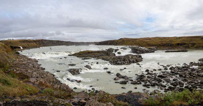 Mercredi 21 septembre : debout à 7h30. On boucle les valises. Départ vers 9h15. La météo n’est pas terrible en quittant Reykjavik (couvert, bruine, 9°C) mais cela s'améliore ensuite. On emprunte la route 1 sud et on enchaîne les cascades. On commence par Urridafoss. La rivière est large et la cascade impressionnante. On aperçoit un poisson qui tente de remonter la cascade.