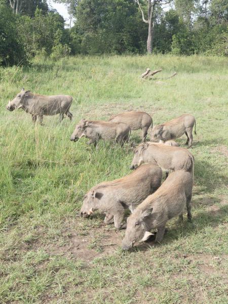 As a result, we eat late, around 11.00 am. On the way back to camp, we come across warthogs and giraffes.