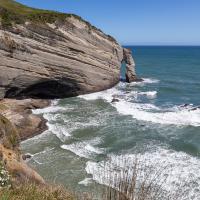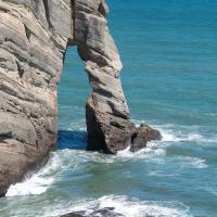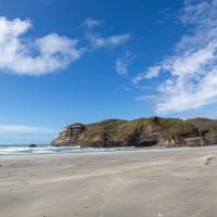 Accès : après avoir suivi la côte et emprunter la route 60 jusqu'à Collingwood, suivre la Collingwood-Puponga Main Road puis la Wharariki Road (route praticable mais non goudronnée) jusqu'au parking de l'Archway Cafe. Il faut ensuite emprunter le sentier qui mène à la plage. Le chemin passe par des belles prairies ou paissent les moutons (voir Puponga ci-dessous) puis après être passé en forêt, le sable sur le sentier annonce l'approche de la plage.