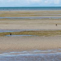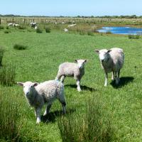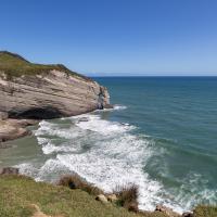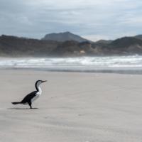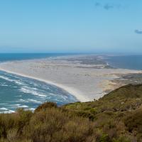 Pour notre part, nous avons combiné Spit Track et Fossil Point Track. La balade commence sur la plage intérieure, sans grand intérêt. La mer est loin, on voit quelques oiseaux. Le sentier s'enfonce ensuite dans une forêt, là aussi, sans grand intérêt. Enfin, on arrive de l'autre côté du bec de kiwi, sur une longue plage de sable fin. On va jusqu'aux falaises de Fossil Point puis on revient vers le parking en traversant des prairies verdoyantes où paissent de nombreux moutons.
