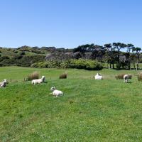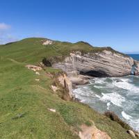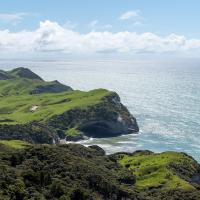Accès : depuis la Wharariki Road, suivre Cape Farewell Lookout Parking. N'hésitez pas à ouvrir la barrière (et la refermer derrière vous) pour aller jusqu'au parking qui se trouve sur des terres privées où broutent des moutons.