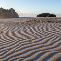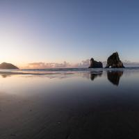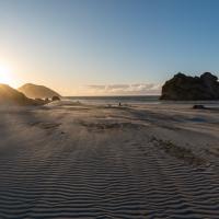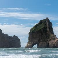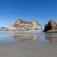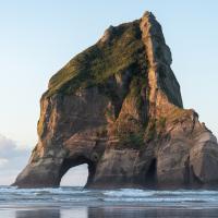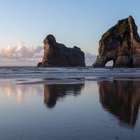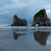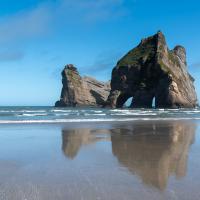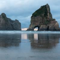 Wharariki Beach est une plage immense de sable fin sans la foule en raison de son isolement. La réputation de cette plage est dûe à ses "rochers arches" : Archway Islands. Il est nécessaire de se décaler vers la gauche de la plage pour observer ces arches. Du haut des dunes au niveau du sentier, la perspective est différente. A marée basse, ces rochers offrent un joli reflet sur le sable mouillé. Comme souvent, les meilleurs moments pour prendre des photos sont au lever ou au coucher du soleil. L'idéal est de camper à Wharariki Beach Holiday Park (voir en bas de la page).
