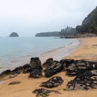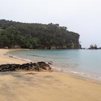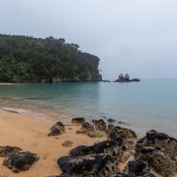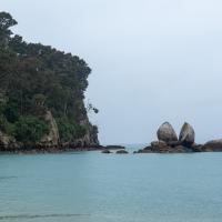 Nous n'avons pas eu la météo de notre côté pour la visite de Split Apple Rock. Depuis la route, un petit sentier en forêt descend vers la plage. La plage de sable clair et l'eau turquoise sont mangifiques, même sous la pluie. La pomme coupée est juste en face du sentier mais il faut se décaler vers la droite pour voir la coupe nette du rocher.