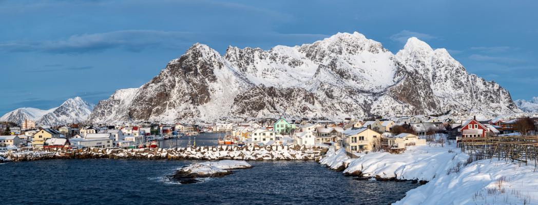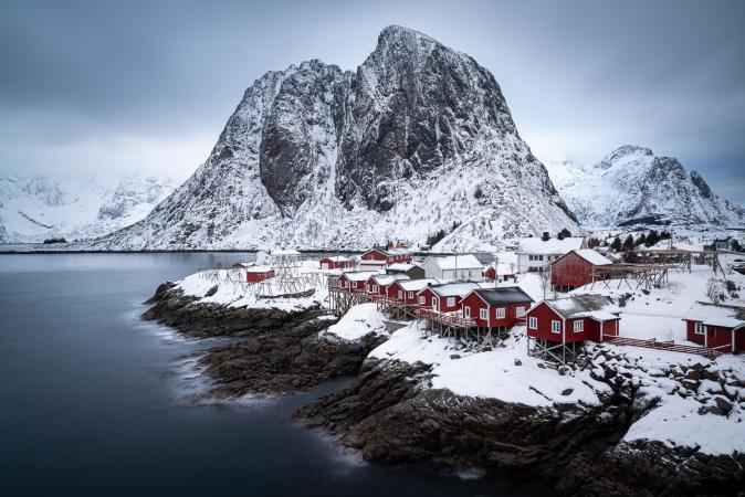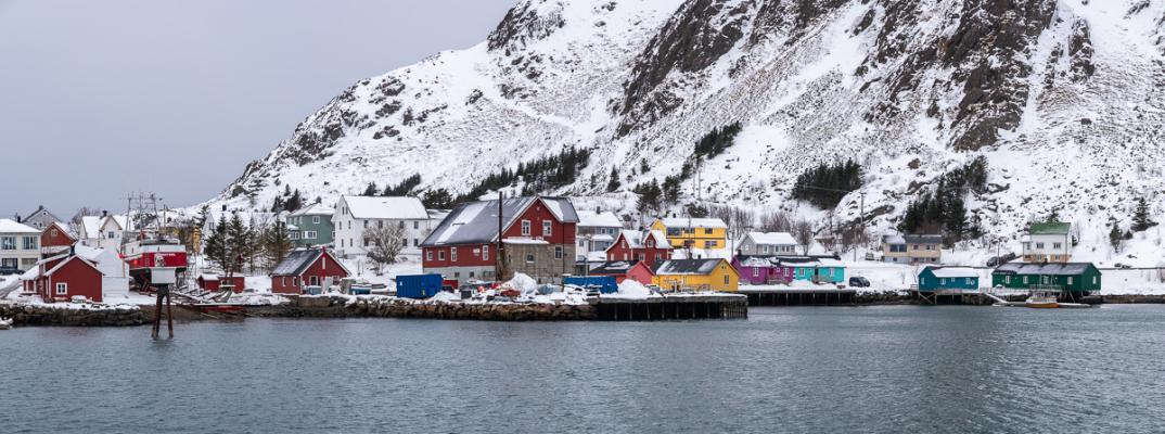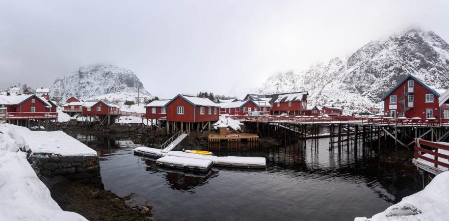 Jeudi 15 février : départ à 9h en direction du village de A (qui se prononce O). Il fait -1° mais avec le vent, on a l'impression qu'il fait plus froid. Arrêt photos à Hamnoy. Ce n'est pas la même lumière que l'autre jour, mais c'est joli quand même.