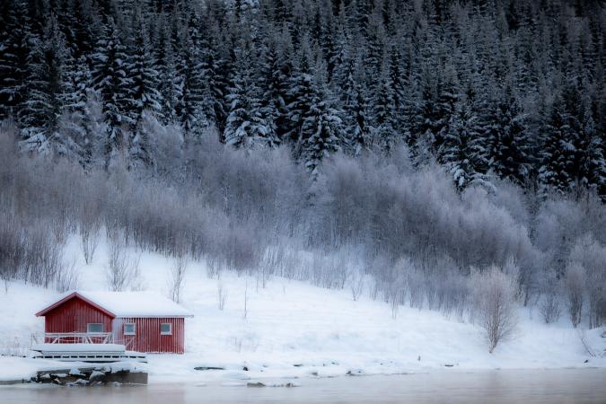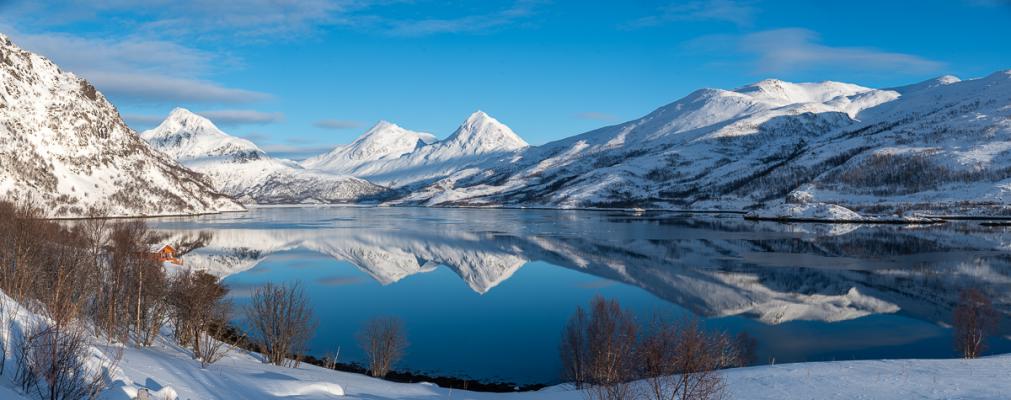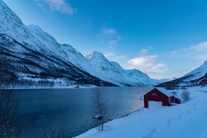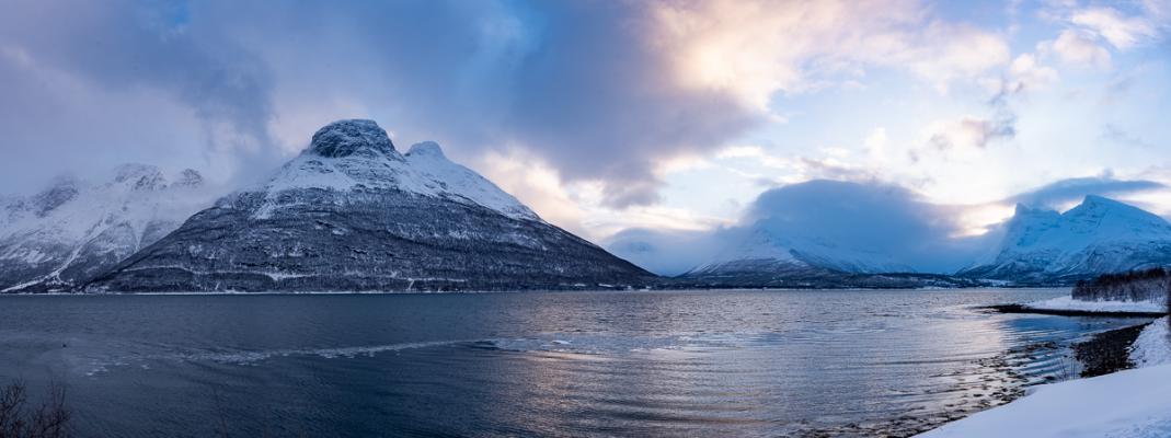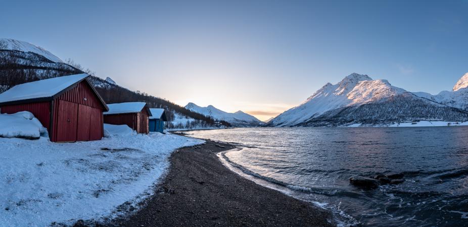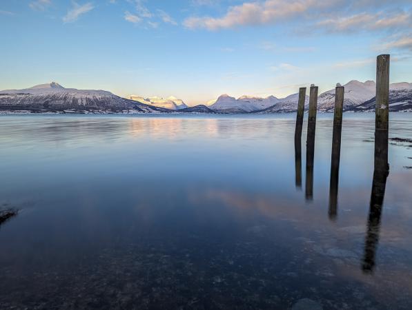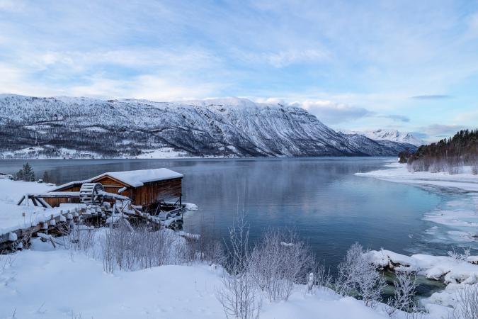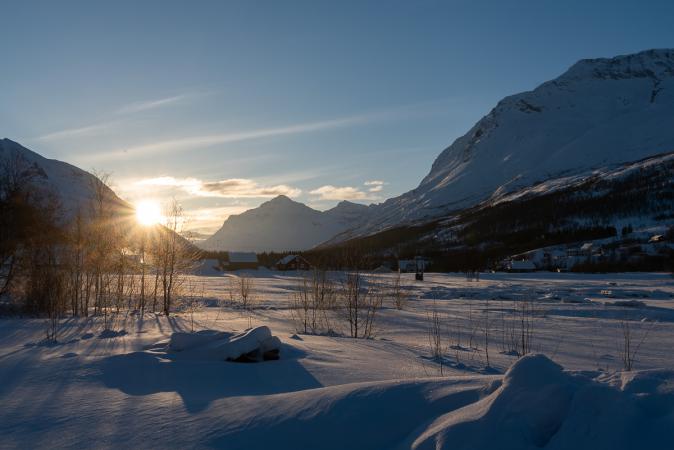 Lundi 5 février : il est prévu beau temps aujourd'hui mais pour l'instant c'est couvert. Départ à 9h25. On prend la route pour Nordkjosbotn. Quelques photos. Le soleil commence à sortir des nuages. On continue jusqu'à Sorbotn vers un camping. Il fait -10°. La lumière est belle.