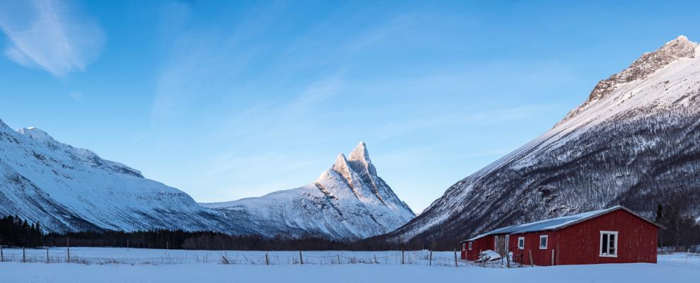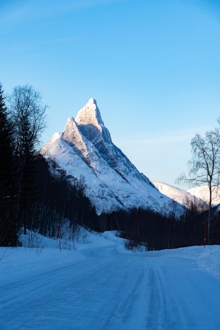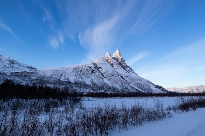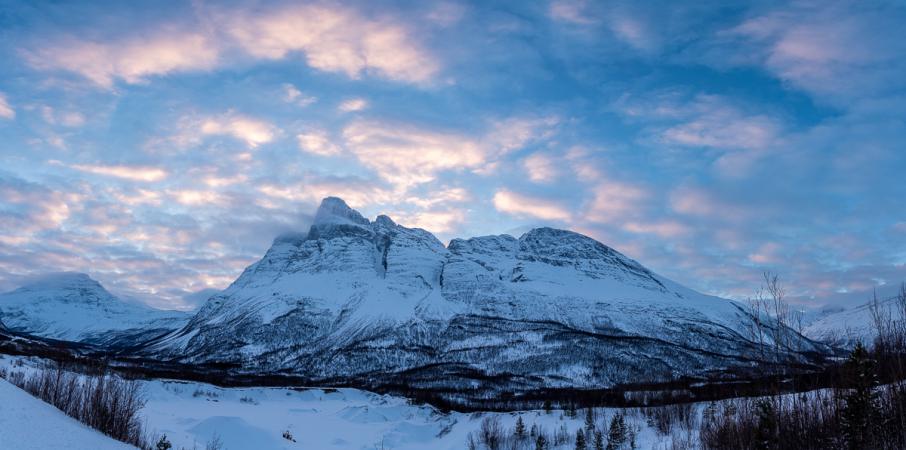 Mardi 6 février : il est annoncé -16°. Départ à 10h45 sous un ciel à peu près dégagé. On va vers la vallée de Signaldalen (route 7928). La voiture annonce -18°. Arrêt photos en route. -20°. Superbe vue sur le mont Otertind. Mais ça pèle.