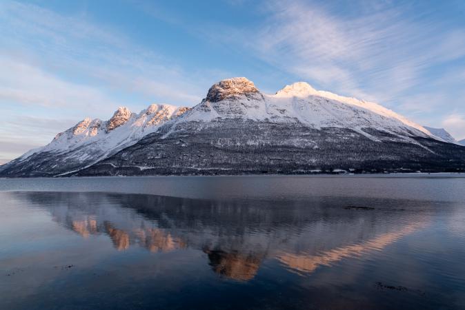 On fait demi tour un peu avant Lakselvbukt pour aller de l'autre côté du fjord en passant par Laksvatn. Dernières lumières sur la montagne.