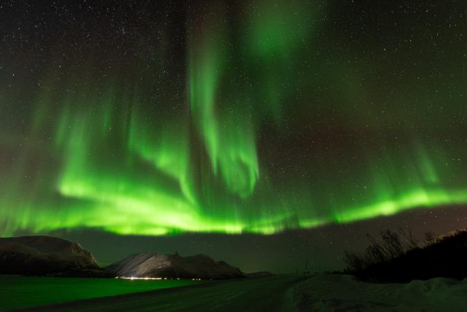 On revient sur nos pas. A 14h30, on s'arrête manger des burgers à Lyngseidet au Go2Arctic Grill. Les bacon cheese sont bons. On repart à 15h35. Le jour commence à baisser. On repère un coin à aurores sur la presqu'île Ornes Sieiddinjarga. Retour à la maison vers 17h. On repart aux aurores vers 19h20, dans le coin où on était cet après midi. Il fait -7° et il y a du vent. C'est un peu couvert par endroit, finalement on va sur la route 91. On se gare plus loin que l'embarcadère. Le ciel est dégagé, il y a des étoiles mais pas d'aurore. On attend… 9h15 ça commence. C'est plus ou moins intense. Seulement KP2 mais c'est pas mal.