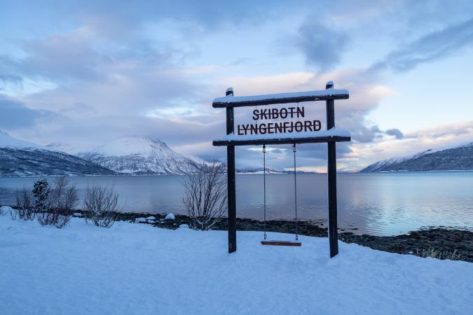 Dimanche 4 février : départ en balade en voiture à 11h, le temps de déneiger la voiture. Le ciel se dégage un peu. Il fait -5°. On fait plusieurs arrêts photos le long du fjord Lyngenfjord tout en se dirigeant vers Skibotn.