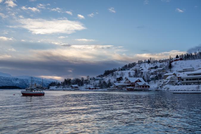 Vendredi 9 février : départ à 9h30. Ciel bleu, quelques nuages et -10°. On va se balader vers le fjord à "trois branches" à l'ouest de Balsfjord : Malangen. On arrive à Nordfjordbotn puis on longe les fjords (route 7834). On photographie un bateau coincé dans la glace.