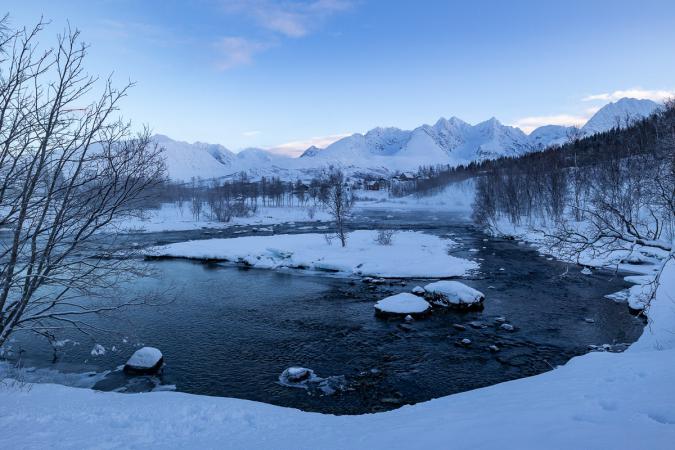 On s'arrête à un coin sympa à Jaegervatn, rivière et vapeur. Des photographes sont sur place mais s'en vont lorsqu’on arrive.