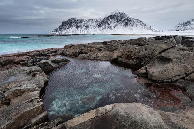 Mercredi 14 février : départ vers 9h30. Notre allée a été dégagée. On va tenter de trouver l'oeil du dragon de Yves à Flakstad. Il fait -3° et il a beaucoup de vent et le ciel est plombé. On ne trouve pas l'oeil mais des petites piscines.