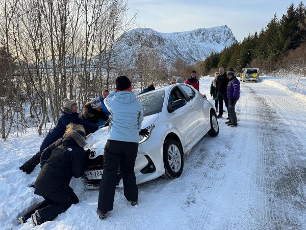 On file ensuite à Vik. Sur la route, on aide une voiture d’allemand bien enfoncée dans la neige. Plusieurs voitures s'arrêtent, on doit être une quinzaine à pousser.