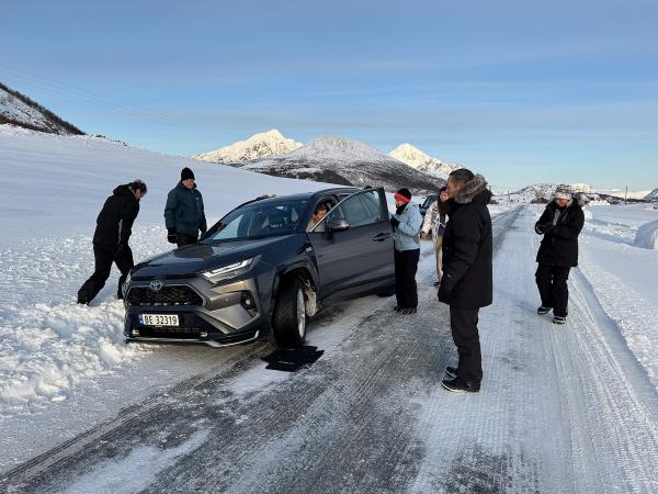 Après plusieurs essais de poussées, on s'enfonce encore plus. Quelques véhicules passent mais ne s'arrêtent pas ! Alors que nous, on a aidé tout le monde !! Un norvégien finit par s'arrêter et nous aide avec une corde mais elle pète. Il appelle un dépanneur pour nous sortir de là. On attend… La dépanneuse arrive à 11h15. Avec son treuil, il nous sort en 5 minutes.