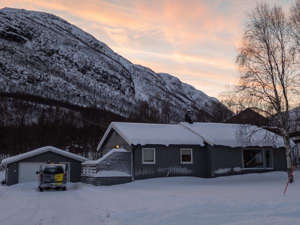 On arrive à Nordfjordbotn vers 18h15 pour aller dîner au resto Vollan (burgers et pâtes au renne). On rejoint ensuite notre maison pour la dernière nuit, dans le camping de Skibotn, le Strandbu Camping. On arrive vers 20h. C'est un petit chalet assez cosy.