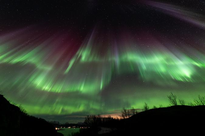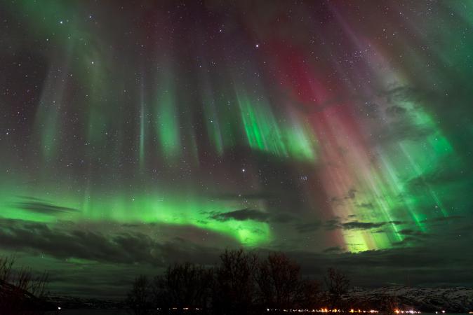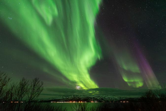 On arrive à la maison à 16h15 juste pour goûter les crêpes. A 19h00, alerte générale : aurores en vue ! On s’installe en bord de route au-dessus de notre chalet. Belle activité plus ou moins intense (KP4-5) avec du vert, du rouge et même du violet et par moment ça bouge beaucoup.