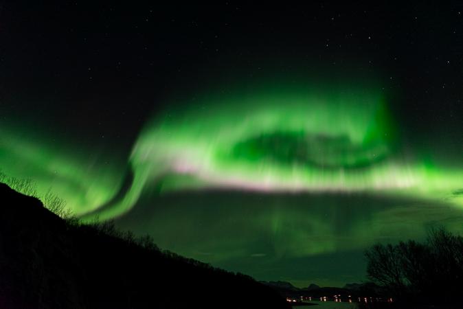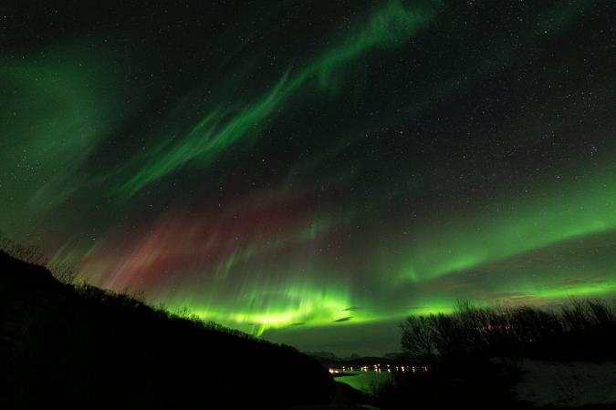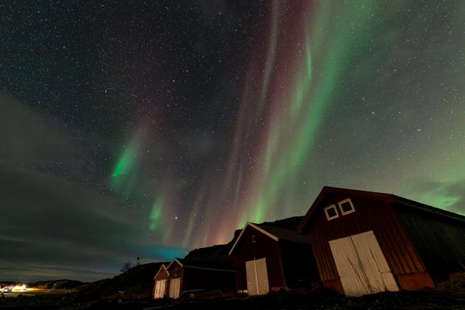 On rentre à 22h30 et à peine 10 minutes après, le propriétaire de la location vient nous prévenir qu'il y a des aurores. On ressort en catastrophe pour les observer depuis la route. Là, c'est beaucoup mieux, c’est KP3. Il y a du vert, du rose/rouge, c’est trop beau.