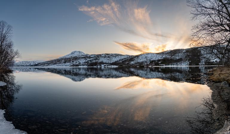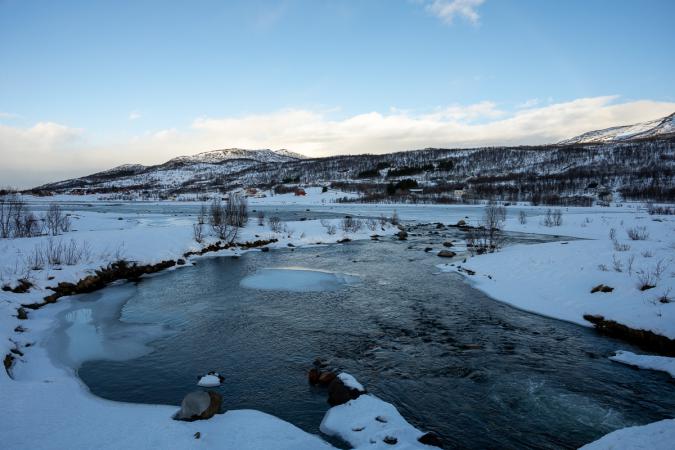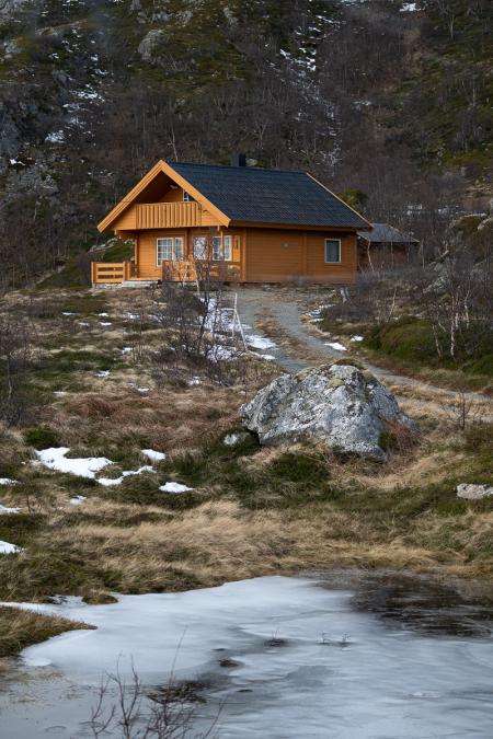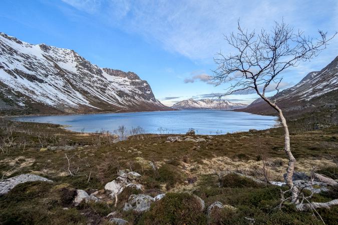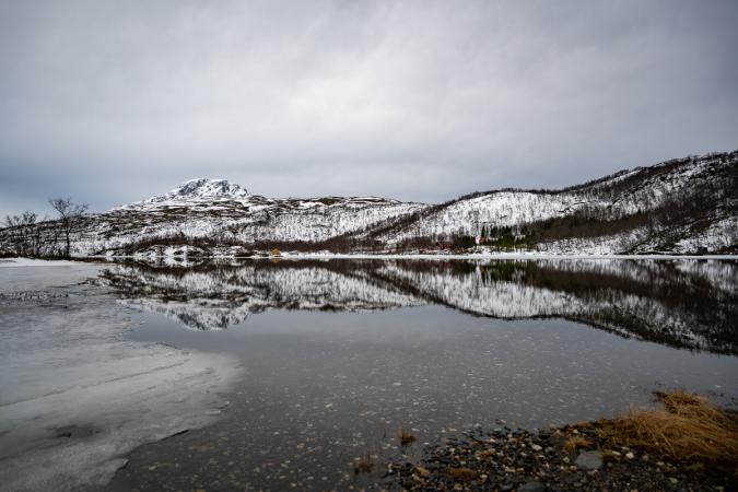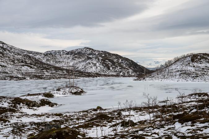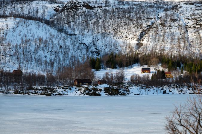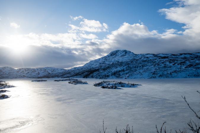 On va jusqu'au lac Skogsfjordvatnet. Avec ses 10 km de long, c’est le plus grand lac îlien de Norvège. Il se situe à 20 mètres au-dessus du niveau de la mer. Il est gelé, ça donnerait presque envie d’aller patiner dessus !