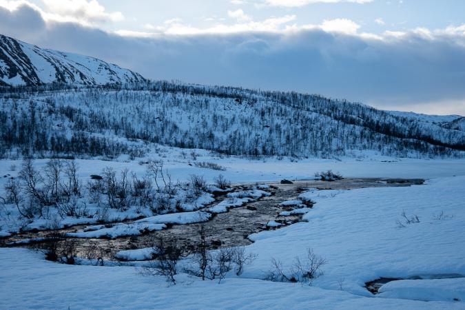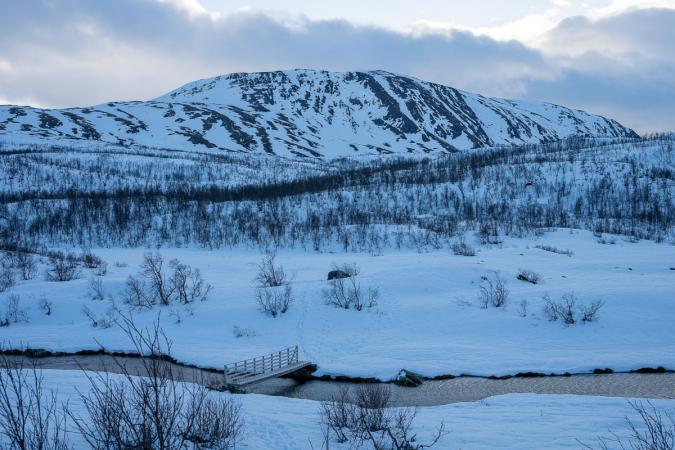 Un peu plus loin sur la route, on s’arrête car on voit un p’tit coin sympa avec un pont en bois au-dessus d’une rivière. C’est en contre-bas de la route, on descend dans la neige en s'enfonçant jusqu'aux mollets.