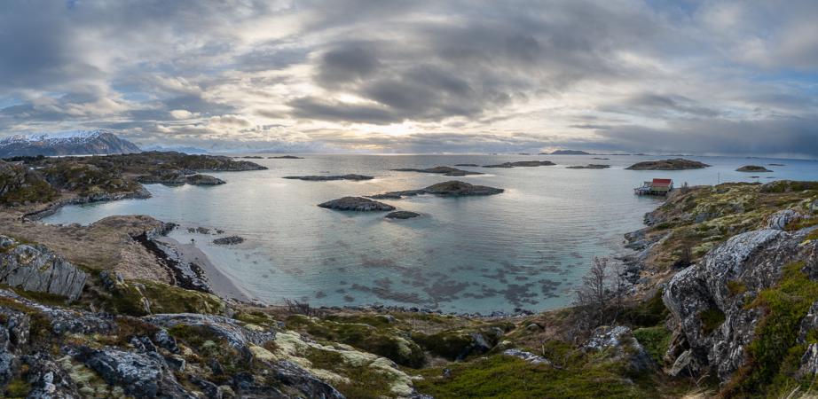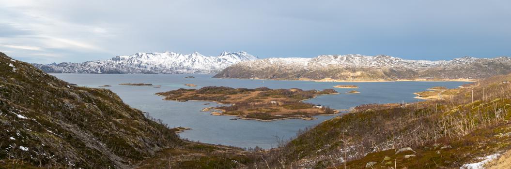 jusqu'à Skogvik puis au bout de la route Måsvikvegen qui est en cul de sac. On prend un peu de hauteur à pied sur une colline et là, la vue est superbe.
