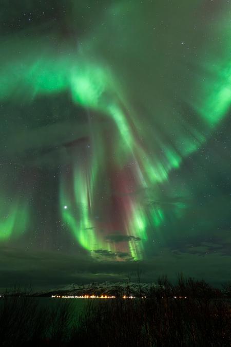 On s'arrête au café Bryggejentene pour un chocolat chaud et gâteaux. Puis on va faire le plein d'essence et de courses. On rentre à la maison à 17h30. On dîne et vers 20h00, on file vers les petites cabanes rouges au bout de notre rue. Il y a un peu d'activité aurorale mais ce n’est pas fou-fou comme diraient certains.