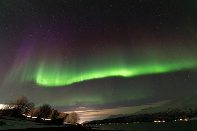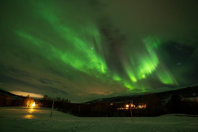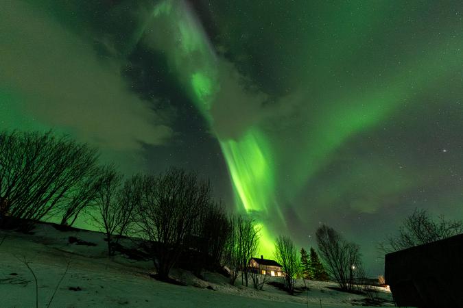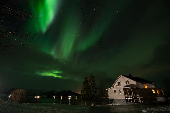 Retour à la maison vers 17h00. Tradition oblige, on fait une croziflette avec du reblochon amené de France. Dodo vers 23h00. Dans la nuit à 1h45, je me lève pour aller aux toilettes. En passant, je jette un œil par la fenêtre de l'escalier et j'aperçois du vert. Je vérifie par une autre fenêtre. En revenant au lit, je le dis à David qui va vérifier en faisant une photo. Cinq minutes plus tard, il réveille tout le monde. Et à 2h00, on est tous dehors. Le ciel est tout vert.