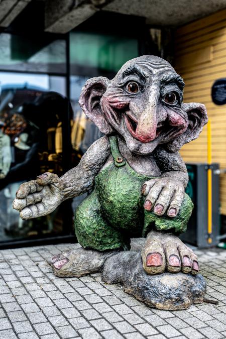 Mercredi 11 mars : debout vers 8h00. Départ à 10h00 pour Tromso. C’est couvert et il fait 5°. On se gare dans un parking souterrain en centre-ville. On se balade dans la ville et le port sous un peu de soleil. L'accueil devant une boutique de souvenirs :