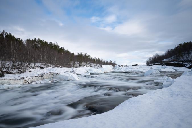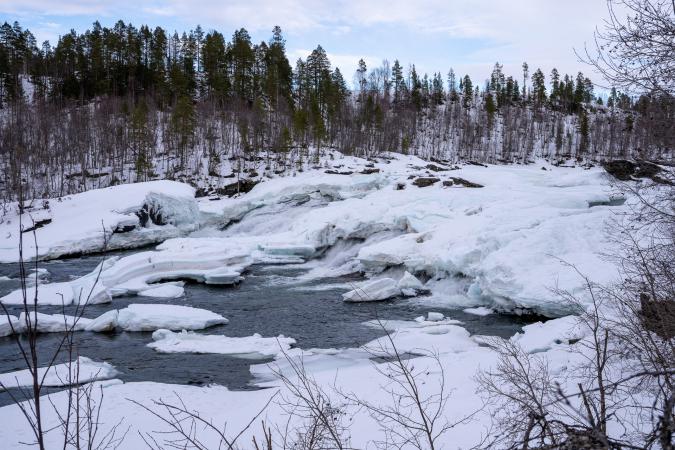Vendredi 13 mars : debout à 8h30. Couvert et quelques gouttes de pluie. On part à 10h30. La pluie s'est arrêtée. On va voir la cascade Bardufossen mais elle est gelée et il n’y a pas de parking accessible. On file ensuite à la cascade Malselvfossen. Il y a un grand parking pour les camping-car et des sanitaires. La chute est grande, on a une première vue d'en-haut.