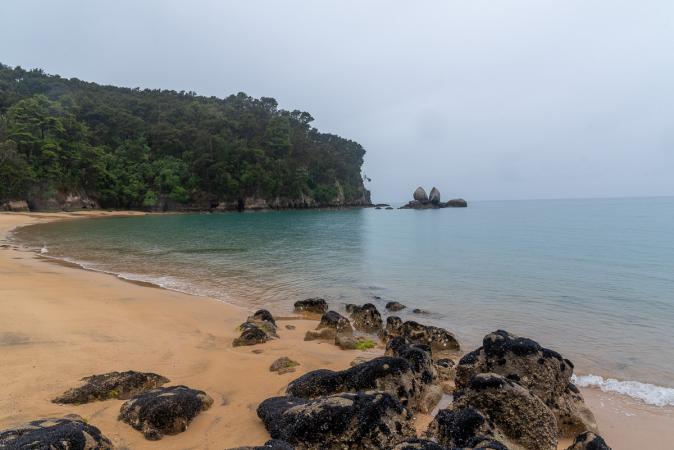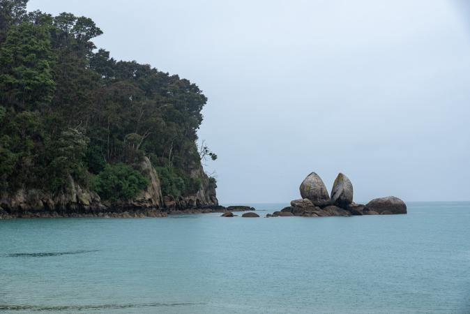 Vendredi 3 novembre : debout à 7h45. Pour changer, il pleut. On part vers 9h30 direction Split Apple Rock. On y est en une demi-heure. Il faut se garer sur la route. On met les pantalons de pluie et les impers et on prend ensuite un sentier dans la forêt qui descend jusqu'à la mer. La plage de sable clair et l'eau turquoise sont magnifiques.