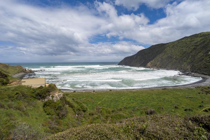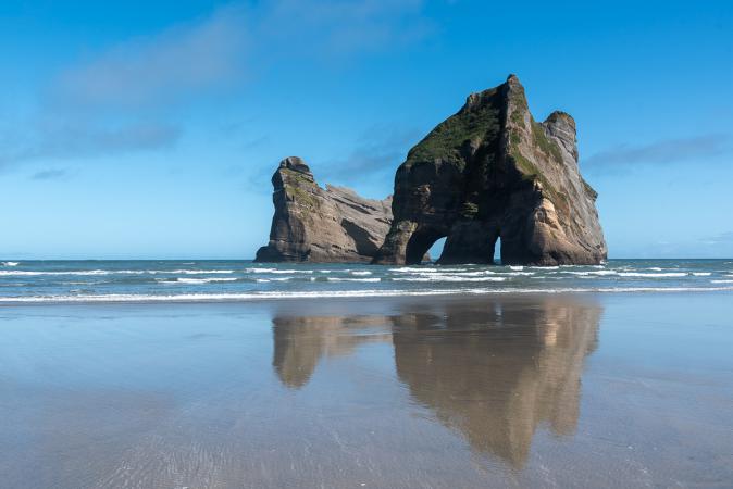 Wharariki est une belle plage et peu fréquentée. On se déplace sur la gauche pour voir les arches dans les rochers.