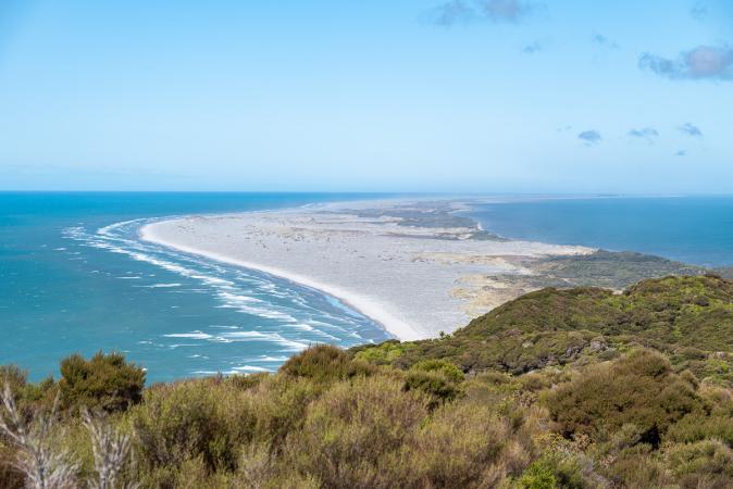 On continue un peu plus loin en van pour aller sur Farewell Spit. On se gare à Triangle Flat. Il est midi lorsqu'on démarre la rando Spit Track du parking jusqu'à la plage puis on coupe par Fossil Point Track.