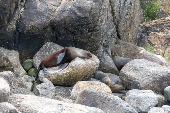 On repart à 15h15 vers la colonie d'otaries sur Tauranga Bay. Ce n'est pas vraiment une colonie, ils sont très peu. Le point de vue est en hauteur donc pas terrible.