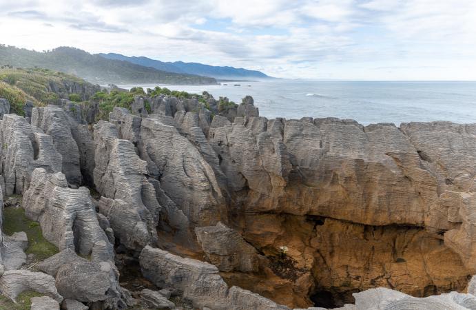 Lundi 6 novembre : debout à 7h00. Petit déjeuner dans le van. Il fait beau malgré le ciel couvert. Départ à 8h20. Retour aux Pancakes Rocks.